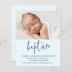 This modern photo baby baptism invitation features hand lettered calligraphy script baptism art that is moveable and that you can easily change the colour of, a horizontal photo and editable text. Click the edit button to customize this design.