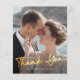 This is a budget friendly modern and minimalist photo wedding thank you card with a gold handwritten script, printed on a flat paper sheet. Easily change the text and photo using the template provided. The reverse side includes another photo and a thank you message that you can personalize or remove altogether if you prefer to hand write your thank you note.