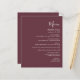 Ce menu mariage simple et moderne présente du texte blanc sur un arrière - plan bordeaux foncé. Le mot "Menu" apparaît en calligraphie manuscrite stylisée. Ajoutez le nom du couple et la date du mariage dans le script et l'italique, ainsi que les détails du menu dans la police sans serif. L'envers est assorti d'une teinte bordeaux solide.
