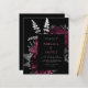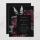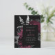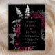 This elegant, moody wedding invitation features a lush, romantic floral bouquet in burgundy red with silver faux foil and glitter foliage on a black background. Customize the pale burgundy and silver grey text in stylish fonts on a dark rectangle. The reverse side is solid black.