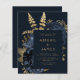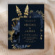 This elegant, moody wedding invitation features a lush, romantic floral bouquet in navy blue with gold faux foil and glitter foliage on a dark blue background. Customize the gold-coloured text in stylish fonts on a dark rectangle. The reverse side is solid dark blue.