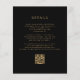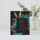 This elegant, moody wedding invitation features a lush, romantic floral bouquet in turquoise with gold faux foil and glitter foliage on a black background. Customize the gold-coloured text in stylish fonts on a dark rectangle. The reverse side provides space for wedding details on a solid black background, along with a QR code guests can scan to visit your website and RSVP, which saves the cost of printing and mailing separate RSVP cards.