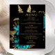This elegant, moody wedding menu features a lush, romantic floral bouquet in turquoise with gold faux foil and glitter foliage on a black background. Customize the gold-coloured text in stylish fonts on a black rectangle. The back of the card is solid black.