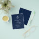 This budget minimalist classic navy blue nautical wedding invitation design features an anchor monogram at the top with the initials of the bride and groom, with a touch of script calligraphy for the "and".