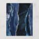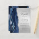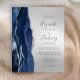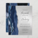 The left-hand edge of this elegant modern wedding invitation features a navy blue watercolor agate border trimmed with faux silver glitter. The customizable text combines charcoal grey handwriting, copperplate and italic fonts on a silver faux foil background. The reverse side features a matching navy blue and silver agate design.