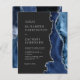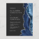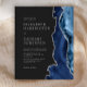 The right edge of this elegant modern wedding invitation features a navy blue watercolor agate border trimmed with faux silver glitter. The customizable text combines silver grey serif, copperplate and italic fonts on a slate black background. The reverse side features a matching navy blue and silver agate design.