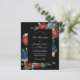 Elegant burgundy red roses and peonies along with navy blue flowers create a rustic floral frame around your wedding details. Small white daisies with yellow centres add a splash of colour. A variety of greenery surrounds the flowers.