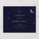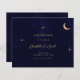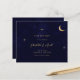 A minimalist modern celestial wedding invitation features a simple and elegant design. It includes a gold foil moon and stars that gently sparkle, set against a midnight blue background. The invitation uses classic serif typography, which adds a traditional and formal touch with its neat and clear style.
