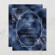 This elegant modern wedding invitation features a silver geometric frame decorated with navy blue and silver floral bouquets on a navy blue faux foil background. The customizable text combines silver grey whimsical handwriting, copperplate and italic fonts. The reverse side is solid navy blue.