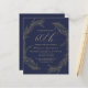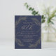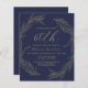 This sophisticated 60th (or edit to any year) birthday party invitation features a gold line art drawing of a foliage wreath on a navy blue background. The number "60th" and the name of the guest of honour appear in elegant gold-coloured handwriting script, with the rest of the customizable text in sans serif font. The back of the card is solid navy blue.