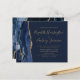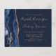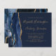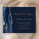 The left-hand edge of this elegant modern wedding invitation features a navy blue watercolor agate border trimmed with faux gold glitter. The customizable text combines gold-coloured handwriting, copperplate and italic fonts on a navy blue background. The reverse side features a matching navy blue and gold agate design.