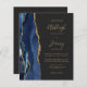 Save the cost of printing and mailing separate RSVP cards with this elegant modern all-in-one budget wedding invitation. The left-hand edge features a navy blue watercolor agate border trimmed with gold faux glitter. The customizable text combines gold-coloured handwriting, copperplate and italic fonts on a slate black background. The reverse side provides space for wedding details on a solid slate black background, along with a QR code guests can scan to visit your website and RSVP.