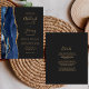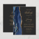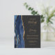 The left-hand edge of this design features a navy blue watercolor agate border trimmed with gold faux glitter. The customizable text combines gold-coloured handwriting, copperplate and italic fonts on a slate black background. The reverse side provides space for additional wedding details on a solid slate black background.