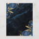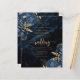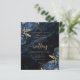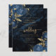 This elegant wedding invitation features blue floral bouquets set off with gold faux foil greenery in two corners, on a background image of navy blue watercolor agate. The customizable text combines gold-coloured serif, italic and handwriting fonts. The reverse side features a matching navy blue and gold floral and agate design.