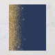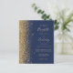 The left-hand edge of this elegant modern wedding invitation features a gold faux glitter border. The customizable text combines pale gold coloured handwriting, copperplate and italic fonts on a navy blue background. The reverse side features a matching navy blue and gold design.