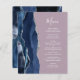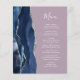 The left-hand edge of this elegant modern wedding menu features a navy blue watercolor agate border trimmed with faux silver glitter. The customizable text combines white handwriting script and copperplate fonts on a mauve purple background. The reverse side features a matching navy blue and silver agate design.