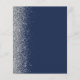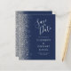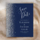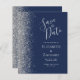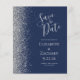 The left-hand edge of this elegant modern wedding save the date card features a silver faux glitter border. The customizable text combines silver grey handwriting and copperplate fonts on a navy blue background. The reverse side features a matching navy blue and silver design.