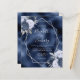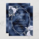This elegant modern wedding invitation features a silver geometric frame decorated with dusty blue, navy blue and silver floral bouquets on a navy blue faux foil background. The customizable text combines silver grey whimsical handwriting, copperplate and italic fonts. Add additional details on the back, along with a QR code to help your guests visit your wedding website.