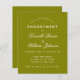 A simple engagement party invitation. It has only white text on olive green. The names are written in an elegant calligraphic script, the rest in caps. the first line is arched text.
