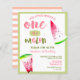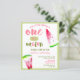 Budget One in a melon first birthday party invitation for your little girl, featuring watercolor watermelon slices. The colour scheme is mainly pink and green.