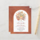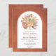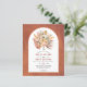 Tropical dried palm leaves, pampas grass and protea flowers terracotta arch wedding invitation. This pretty wedding design features an arch frame on terracotta stained background. In the frame there is a bouquet of dried palm leaves, protea flowers and pampas grass.