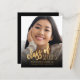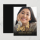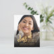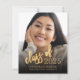 Modern graduation announcement featuring a custom vertical photo. The words "class of" appear in gold faux foil script, followed by the editable class year in gold-coloured open serif font. Add the graduate's name and school below in white sans serif font. Easily replace the sample image with your own graduate's photo. A black gradient screen helps ensure the text pops. The reverse is solid black. Ideal for high school or college graduation.