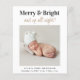 Fun budget-friendly 4 photo Christmas holiday birth announcement. The front features your newborn's picture with "Merry & Bright and up all night!" written in a mix of elegant typography and a stylish gold script. Add your baby's name and birth stats. On the back, add 3 additional photos, a holiday greeting and your names.