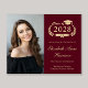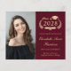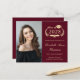 Modern budget-friendly burgundy red college graduation announcement featuring "Class of" in a light gold illustration of laurel wreath incorporating a grad cap topper and diploma, a photo of the graduate and their name in an elegant light gold script. Add their school, major, honours or future plans.
