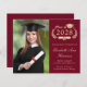 Modern budget-friendly burgundy red college graduation announcement and party invitation featuring "Class of" within a laurel wreath, a grad cap and a diploma, a photo of the graduate and their name in an elegant light gold script. Add their school, major, honours or future plans. On the reverse side, add the party details.