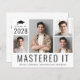 Budget-friendly masters degree graduation announcement and party invitation featuring a 4 picture photo collage, "Mastered It" written across the bottom in large capital letters and his or her class year, name and college or university in simple typography. On the reverse side, add the graduation party details.
