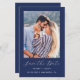 This simple, minimalist Save the Date card features a vertical photo above the words "Save the Date" in elegant white handwriting script, followed by the couple's names, wedding date and city in sans serif font on a navy blue background. Add a more detailed message with additional information on the reverse, along with a QR code to help your guests visit your wedding website.