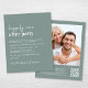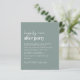Chic budget-friendly sage green wedding reception invitation featuring "Happily Ever After Party" in a blend of a contemporary white script and bold minimal modern white lettering, and your names in a signature-like script. On the back, upload your photo and input your wedding website address to create a QR code for your guests to scan to RSVP online and obtain additional wedding details. This budget semi-gloss paper is similar in weight to photo paper. A larger 5x7 traditional card stock version is also available (message us for the link).