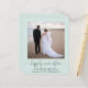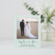 Budget-friendly light mint green elopement or private wedding announcement and post-wedding reception invitation with your photo, "happily ever after" in a chic calligraphy script with swashes and your first names, wedding date and location. On the reverse side, customize your announcement and reception or party invitation, input your wedding website URL address to create a QR code for guests to scan to see your wedding photos, all the details and to RSVP online and sign your married names in a signature-like script.