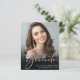 A budget-friendly option to announce your graduate's achievements. This stylish graduation announcement features her favourite photo with "Graduate" written on top in an elegant white script. Underneath you can add her name, school and class year. On the reverse side, add an additional photograph and a personalized message.