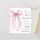 Chic budget-friendly bridal shower invitation featuring a watercolor of a light pink coquette bow, "She's tying the knot" in a modern calligraphy script, and her name and the event details in simple lettering. This budget semi-gloss paper is similar in weight to photo paper. A larger 5x7 traditional card stock version is also available (message us for the link).