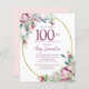 Elegant 100th Birthday Party invitation template features a gold frame and two arrangements of blush pink roses. All of text is editable.