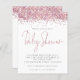Budget Pink Glitter Baby Shower Invitation. A budget price SMALLER 4.5” x 5.6” alternative. Available in a SEMI GLOSS 110 lb CARD STOCK which is the default option (recommended for invitations, similar to the thickness of a postcard), OR a SATIN FINISH 80 lb THINNER PAPER STOCK (ideal for enclosures). A touch of sparkle to celebrate the mom to be with a faux glitter border at the top on both sides and occasion header in a set informal script. Easily personalise the rest of the text to your own details.