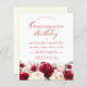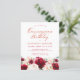 Red roses and blush pink peonies are nestled in dark green leaves on this beautiful and unique birthday invitation.