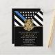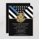 This design features a police force flag with black and white stripes, and a thin blue line stripe as well. The police badge and gold text sits above all of the party details for the retiring law enforcement officer, sheriff, captain, or chiefs retirement party details.