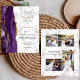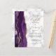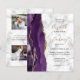 The left-hand edge of this elegant modern wedding invitation features a purple watercolor agate border trimmed with faux gold glitter. The customizable text combines gold-coloured handwriting script with black copperplate and italic fonts on a grey and white marble background. The reverse side provides spaces for 4 photos (1 square, 2 horizontal, 1 long vertical) and room for your wedding website URL or other information.