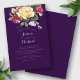 Budget wedding invitation. Elegant bouquet of yellow rose and pink, red, lilac sweet pea flowers, green leaves and buds. Dark purple background. Elegant lettering. Bold and striking wedding design. Artwork is based off a vintage card.
