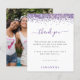 Budget Purple Glitter Photo Bridal Shower Thank You. A budget price SMALLER 4.5” x 5.6” alternative. Available in a SEMI-GLOSS 110 lb CARD STOCK which is the default option (thicker for invitations), OR a SATIN FINISH 80 lb THINNER PAPER STOCK (ideal for enclosures). Envelopes are an optional extra and are slightly larger than the card size. A faux glitter border in purple is at the top, and Thank You is in an elegant script. Easily personalise the text to your own details. On the back swap in your favourite photo from your shower of portrait orientation.