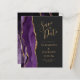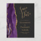 The left-hand edge of this elegant modern wedding invitation features a purple watercolor agate border trimmed with faux gold glitter. The customizable text combines gold coloured handwriting, copperplate and italic fonts on a dark charcoal grey background. The reverse side features a matching purple and gold agate design.