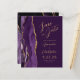 The left-hand edge of this elegant modern wedding save the date card features a purple watercolor agate border trimmed with faux gold glitter. The customizable text combines gold-coloured script and sans serif fonts on a plum background. The reverse side features a matching purple and gold agate design.