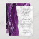 The left-hand edge of this elegant modern wedding invitation features a purple watercolor agate border trimmed with faux silver glitter. The customizable text combines black handwriting, copperplate and italic fonts on a grey and white marble background. The reverse side features a matching purple and silver agate design.