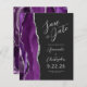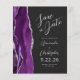 The left-hand edge of this elegant modern wedding save the date card features a purple watercolor agate border trimmed with faux silver glitter. The customizable text combines silver grey script and sans serif fonts on a slate black background. The reverse side features a matching purple and silver agate design.
