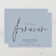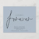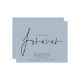 Budget QR Code We Decided on Forever Blue Save The Date A budget price SMALLER 4.5” x 5.6” alternative. Available in a SEMI-GLOSS 110 lb CARD STOCK which is the default option (thicker for invitations), OR a SATIN FINISH 80 lb THINNER PAPER STOCK (ideal for enclosures). Add your QR code to your wedding website on the back. A simple design on dusty blue to invite your guests to save your date. Envelopes are an optional extra. We Decided on Forever which is in a stylish set script is in the centre.The rest of the text you can easily personalise. Text and background colours can be changed if you wish to better suit your wedding theme via the customise further option.