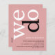 A value for money BUDGET alternative on a smaller size 4.5 x 5.6” semi-gloss 110lbs weight, which is of similar thickness to a postcard (however is not suitable to use as a postcard.). PLEASE NOTE there is ONE invite per sheet. BUDGET Simple QR code Dusty Rose Text Wedding Invite. Add your QR code to your wedding website on the back so your guests can RSVP and see all the details online without the need for separate enclosures. A modern typographical design with We Do in large typography in white with the ”d” in black, rotated and to the left hand side on a background of light dusty rose pink. Background colours can be changed if you wish via Customize further.
