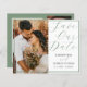 Elegant save the date announcement is prefect to get your wedding plans in motion. It features a photo template and large 'save the date' typography in sage green on a white background. Customize with your own detials.