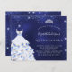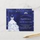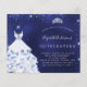 A modern, stylish and glamourous invitation for a Quinceañera, 15th birthday party. A midnight blue background with faux glitter dust, a tiara and a dress. The blue colour is uneven. The name is written with a modern hand lettered style script. Personalize and add your party details.